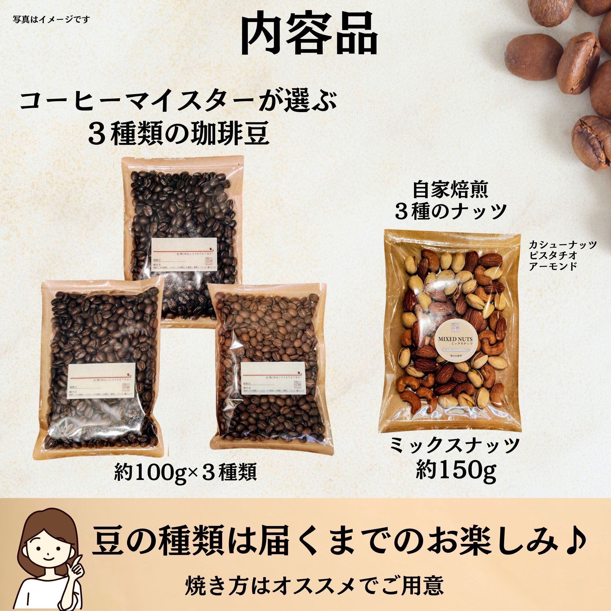 その中から、店長自らが厳選した3種類(各100g)をこねこ便でお届けします。